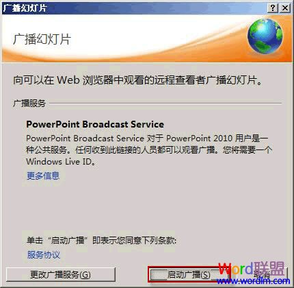 弹出对话框,选择其中的“启动广播”,服务启动完成后,将广播地址链接复制给朋友,并单击“开始放映幻灯片”;