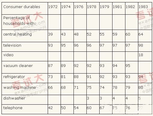 对图表进行横向分析,发现我们可以借助线图的趋势表达来描写各电器百分比的变化,但同时也会陷入一个误区,即面面俱到,对每次变化都进行说明,许多学生会不断重复上升下降等句子,对自己的作文心存疑虑。实际上,对于这种图表,我们只需观察总趋势即可,将首尾年份进行比较,得出几乎所有的电器的家庭占有率都呈上升趋势(Video除外)。至此为止,我们只完成了图表分析的其中一步:典型值的抓取。